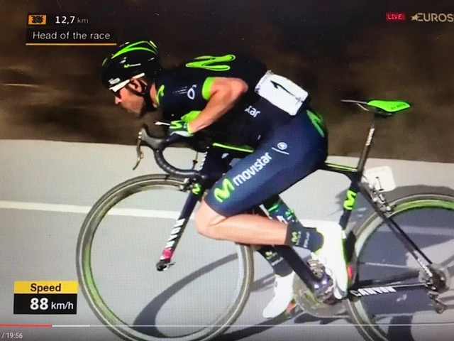 Then there is a shot of Valverde and he is way over his front end while in the top tube, tucked position. Talk about being unstable. The road is pretty good, but this seemed ridiculous, since it really all got back together again anyway.