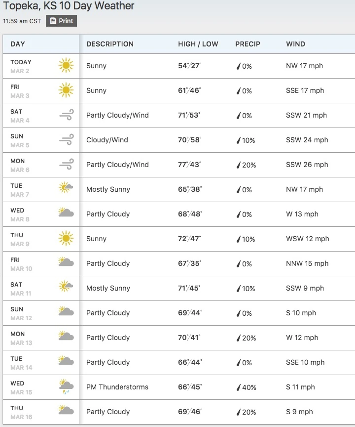 Today it is “only” going to be around 60 degrees. Then it is supposed to get nice. I think that 60 is going to be the low high for the next two weeks. So much for March still being winter here in Kansas.